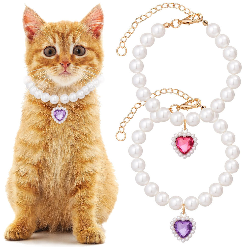 Mxxipp 2pcs Cat Dog Pearl Collar Small Heart Shape Rhinestone Pet Necklace Adjus